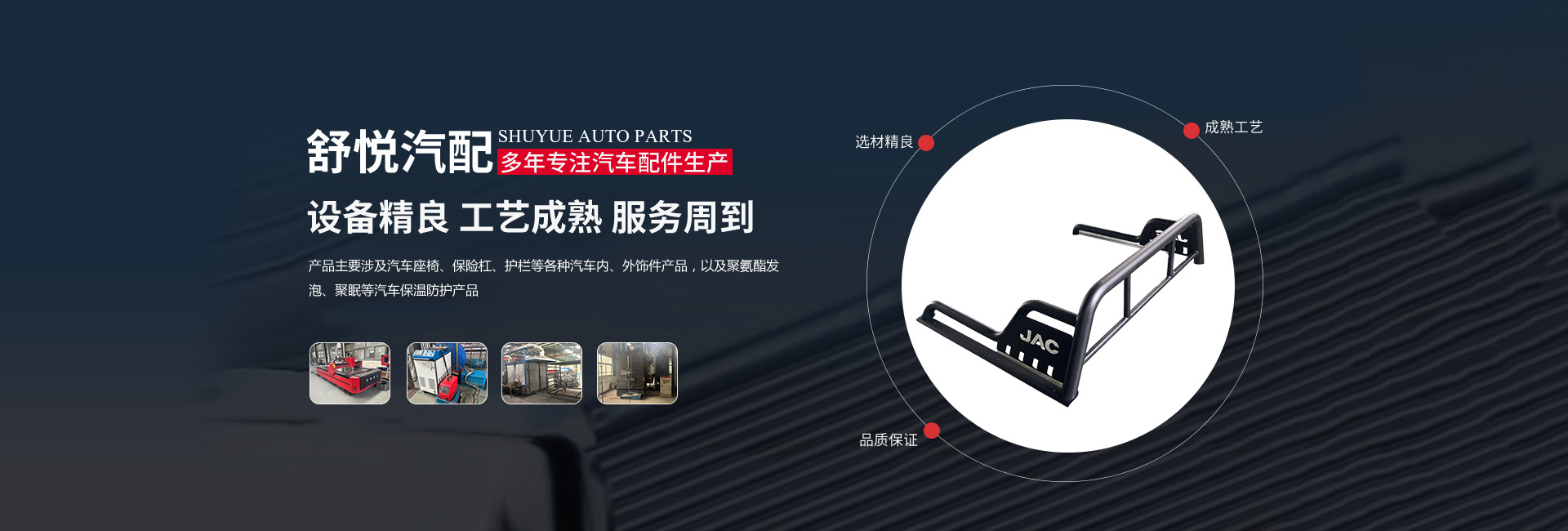 揚(yáng)州舒悅汽配有限公司經(jīng)過(guò)多年的穩(wěn)定發(fā)展,業(yè)績(jī)一直蒸蒸日上。公司產(chǎn)品主要涉及汽車(chē)座椅、保險(xiǎn)杠、護(hù)欄等各種汽車(chē)內(nèi)、外飾件產(chǎn)品,以及聚氨酯發(fā)泡、聚脲等汽車(chē)保溫防護(hù)產(chǎn)品。其主要是為江淮、金龍,奇瑞等公司服務(wù),已連續(xù)多年成為江淮、金龍等公司的A級(jí)供應(yīng)商。        公司成立于1997年,現(xiàn)坐落于揚(yáng)州市儀征劉集盤(pán)古工業(yè)集中區(qū)202號(hào),公司占地面積26640平 方米,廠房建筑面積18512平方米。公司擁有先進(jìn)的制造設(shè)備、可靠的生產(chǎn)工藝、完善的檢測(cè)手段和科學(xué)的管理,在售前和售后服務(wù)中做到快速反應(yīng),應(yīng)急應(yīng)變,為客戶(hù)提供優(yōu)良產(chǎn)品和滿(mǎn)意服務(wù)。公司的產(chǎn)品開(kāi)發(fā)能力和生產(chǎn)規(guī)模在同行業(yè)中處于前列的地位。        揚(yáng)州舒悅?cè)吮小罢\(chéng)信雙嬴”的原則,發(fā)揚(yáng)“誠(chéng)信、務(wù)實(shí)、創(chuàng)新、貢獻(xiàn)”的企業(yè)精神,恪守“顧客至上”的經(jīng)營(yíng)宗旨,致精從業(yè),不斷引進(jìn)新技術(shù)、新材料。以?xún)?yōu)良的產(chǎn)品、合理的價(jià)格和周到的服務(wù)參與市場(chǎng)競(jìng)爭(zhēng)。公司愿與國(guó)內(nèi)外朋友建立真誠(chéng)的合作伙伴關(guān)系,攜手共創(chuàng)輝煌!